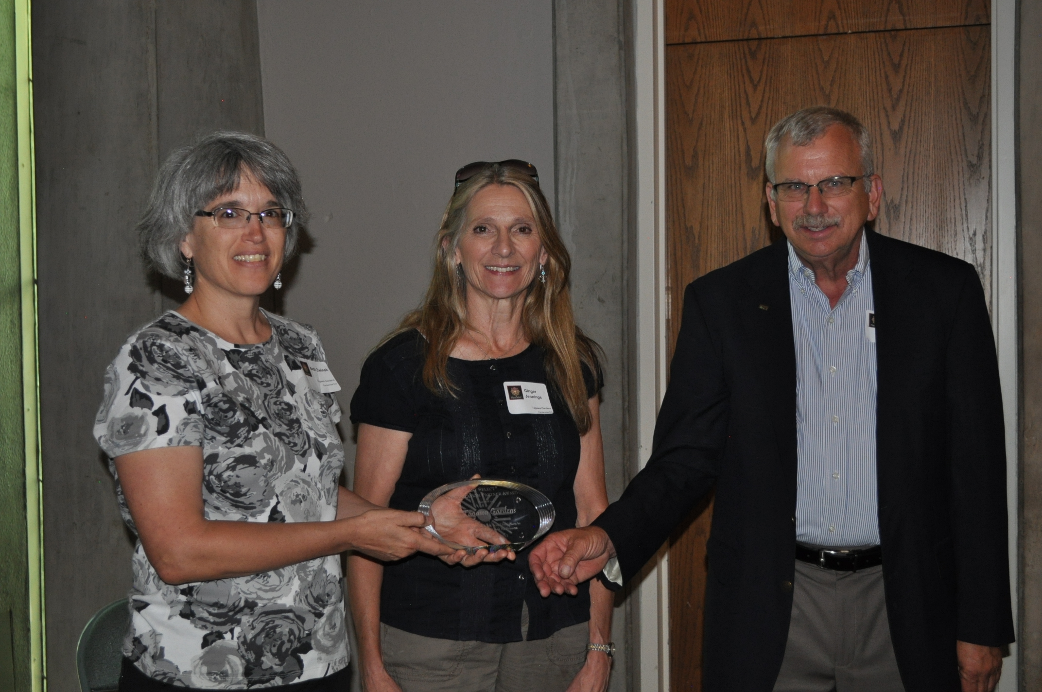 Amanda Strack and Mike Lorenc accept the Showcase Garden Award from Gene Pielin for Conservation Garden Park